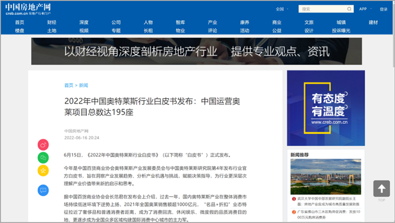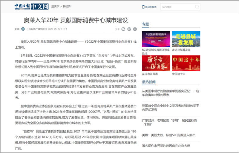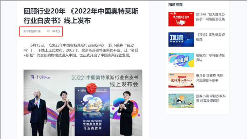 會后,國內主流權威媒體紛紛在第一時間通過各自官方平臺及渠道發(fā)布此次活動盛況及內容。截止6月23日,共計近百家媒體在全網發(fā)布、轉載“2022年中國奧特萊斯行業(yè)白皮書線上發(fā)布”相關報道及新聞百余次,全網累積點擊閱讀量近五百萬次。