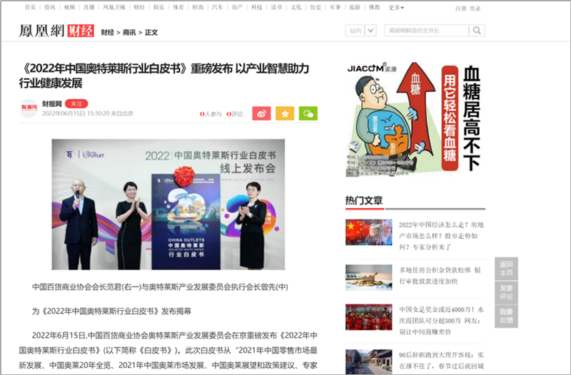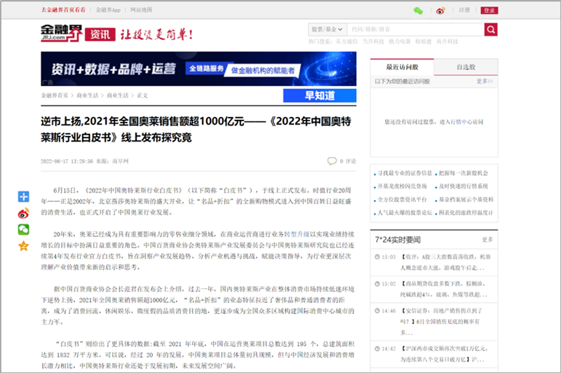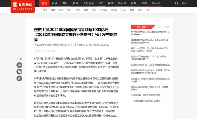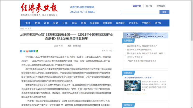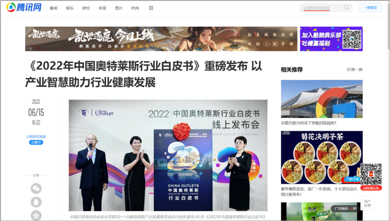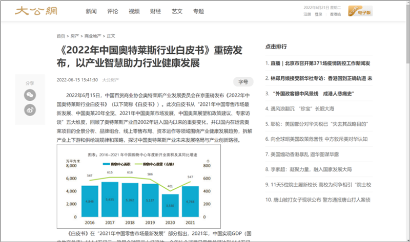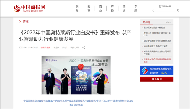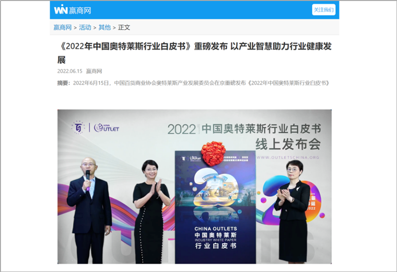 2022年6月15日,中國百貨商業(yè)協(xié)會奧特萊斯產業(yè)發(fā)展委員會線上直播發(fā)布《2022年中國奧特萊斯行業(yè)白皮書》。白皮書中“2021年中國零售市場最新發(fā)展、中國奧萊20年全覽、2021年中國奧萊市場發(fā)展、中國奧萊展望和政策建議、專家訪談”等內容吸引政府領導、專業(yè)機構、產業(yè)運營商、品牌商、服務商、媒體記者及眾多奧萊消費者共計20余萬人參會,成為國內奧萊行業(yè)年度一大焦點。