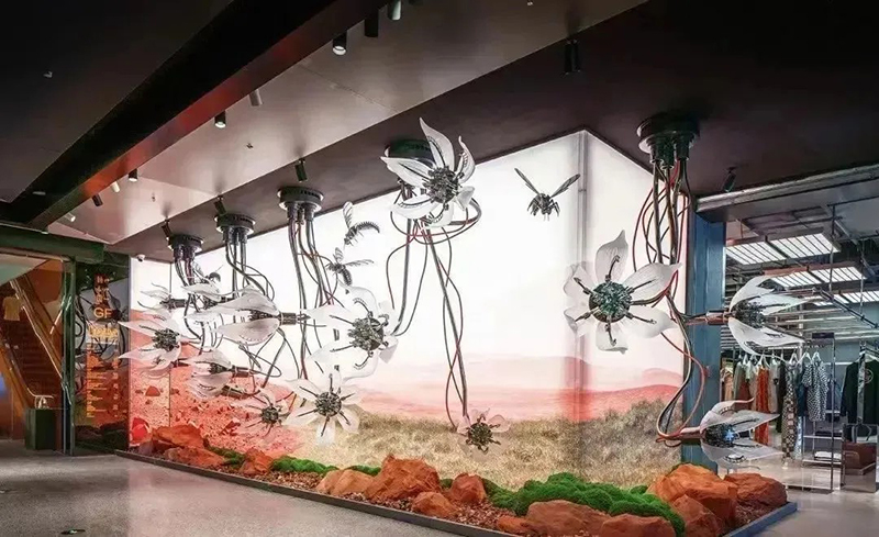 正如北京SKP-S內(nèi)的“未來農(nóng)場”以仿生羊為亮點,成都“平行世界”里猩猩漫步太空引人遐想,武漢SKP亦在負一層SKP-S精心構(gòu)建了特色主題藝術空間《EARTH 2124》。該空間巧妙劃分為三大區(qū)域:北極熊區(qū)《無邊的浮冰》,寓意著冰川的消融與生命的掙扎;走廊區(qū)《新大陸架》,象征著未來世界的重構(gòu)與探索;企鵝區(qū)《覆羽》,則是對極地生物適應環(huán)境、重獲新生的美好愿景。整個空間緊扣“以未來之眼審視全球變暖,攜手極地生靈共繪新篇章”的深刻主題。