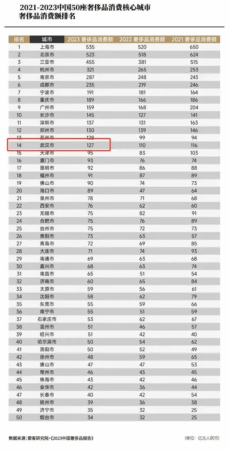 盡管SKP入駐武漢雄心勃勃,但仍面臨諸多挑戰(zhàn)。首要任務是深度挖掘武漢本地的奢侈品消費潛力,盡管這座城市對新興事物展現(xiàn)出高度興趣,但奢侈品消費文化的培育尚需時日。據(jù)要客研究院《2023中國奢侈品報告》揭示,武漢在奢侈品消費領域的表現(xiàn)尚屬中游,2021至2023年間消費額位列全國第14,2023年具體消費額達127億元,這一成績不及華中區(qū)域內(nèi)的鄭州,亦落后于同級別的新一線城市成都與長沙,彰顯了SKP在武漢市場擴展的艱巨性與必要性。