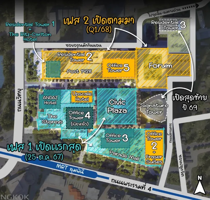 辦公樓方面,現(xiàn)階段3號(hào)塔、4號(hào)塔和5號(hào)塔已經(jīng)陸續(xù)投入使用,包括律師事務(wù)所Baker & McKenzie Ltd.、雅詩蘭黛集團(tuán)、寶馬集團(tuán)、KGI Securities、Menarini、LINE MAN Wongnai等跨國公司都已選擇將辦公地點(diǎn)遷至于此。