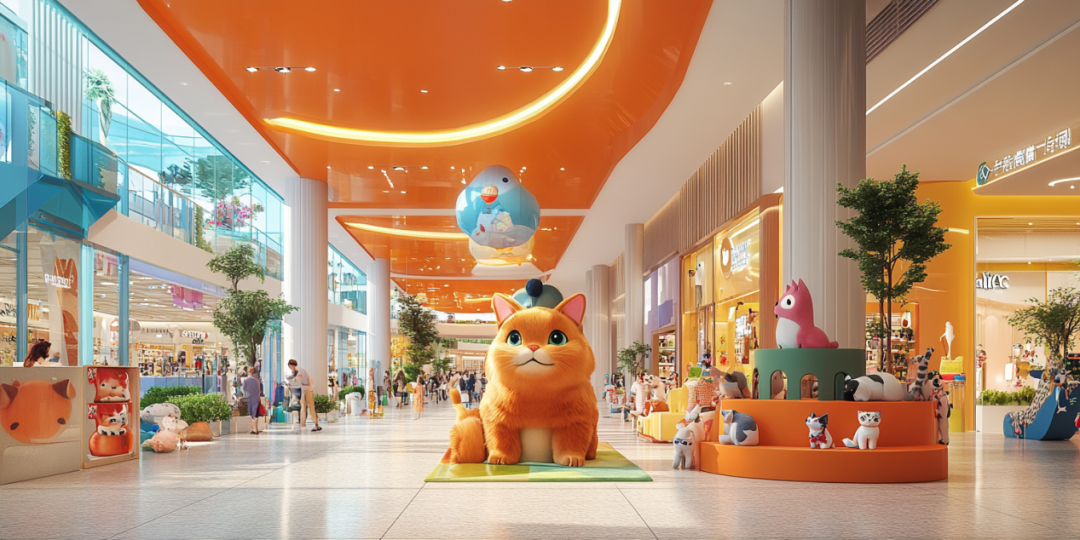 A場景:位于寵物友好購物中心一層,連接室內(nèi)外區(qū)域有家寵物零售店,店門口提供寵物推車,貨品陳列展臺尤其是寵物玩具類展臺略高于寵物推車,與寵物視線基本持平。店鋪店員自帶友好氣質(zhì),對來訪寵物的主動親親貼貼毫無抵抗力。店內(nèi)到處可見主人們各自推著小車帶著貓貓狗狗,三三兩兩聚在一起聊著自家寶貝的名字、習(xí)慣與性格。直接進(jìn)入商場或從店鋪進(jìn)入商場都無需回避安保人員的“眼神拷問”,符合城市飼養(yǎng)規(guī)范的寵物均可自由進(jìn)場。
