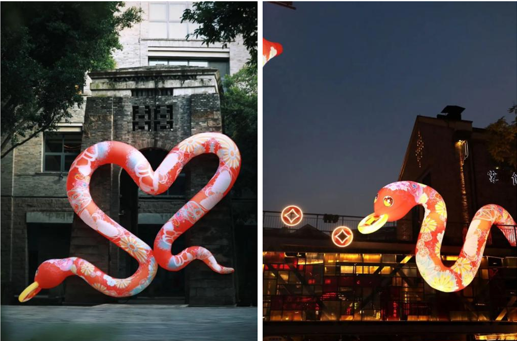 重慶天地聯(lián)手插畫藝術家李旻帶來了“新有福蛇”的藝術裝置。據(jù)了解,該靈感是結(jié)合CHINA DAILY獨有的裝飾風格打造福字花燈,并且將“福祿壽囍財吉”的美好寓意在項目不同角落呈現(xiàn)。