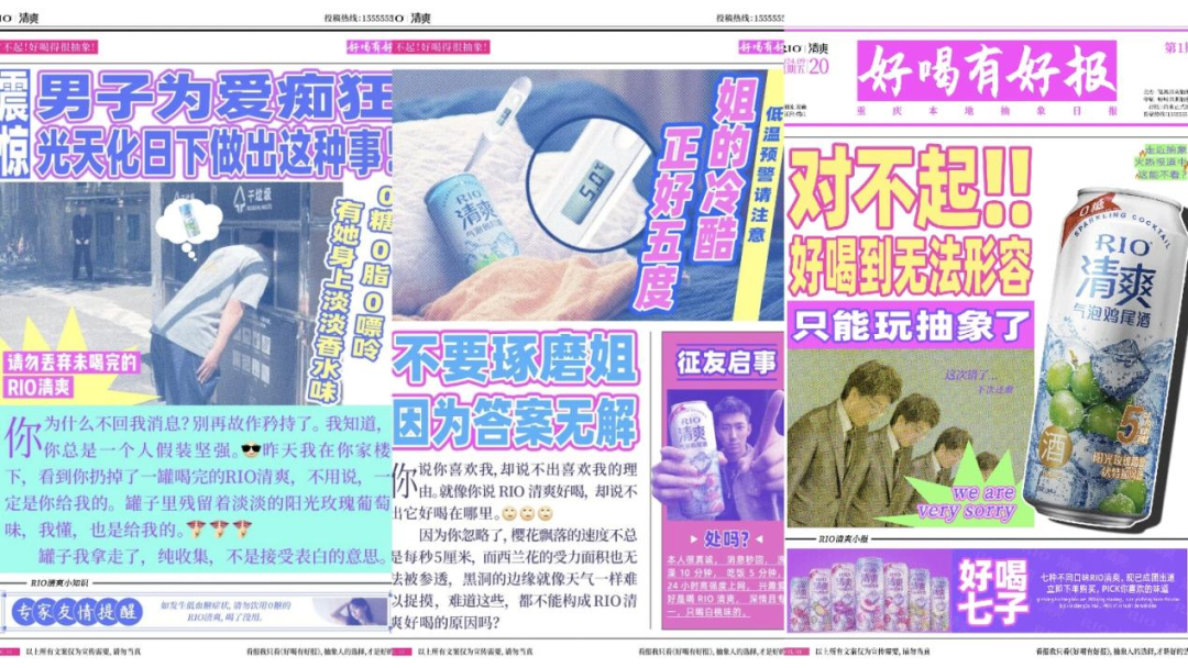 除此以外,RIO微醺化身成戲精上線的「好喝有好報(bào)」主題活動(dòng),在畫風(fēng)設(shè)計(jì)、產(chǎn)品口味描述與故事性上整花活兒,做到了內(nèi)容有料有梗,實(shí)現(xiàn)了用戶與品牌玩在一起。