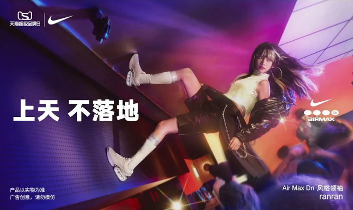 提及“發(fā)瘋”,耐克的「上天不落地」?fàn)I銷大事件也是不得不提一提的。借助新發(fā)布系列的契機(jī),耐克與天貓超級(jí)品牌日牽手,通過與潮流人群共創(chuàng),借助城市文化加強(qiáng)對潮流藝術(shù)的表達(dá),深度溝通年輕人群,在社交平臺(tái)上號(hào)召網(wǎng)友們玩轉(zhuǎn)“先瘋”穿搭共創(chuàng)。