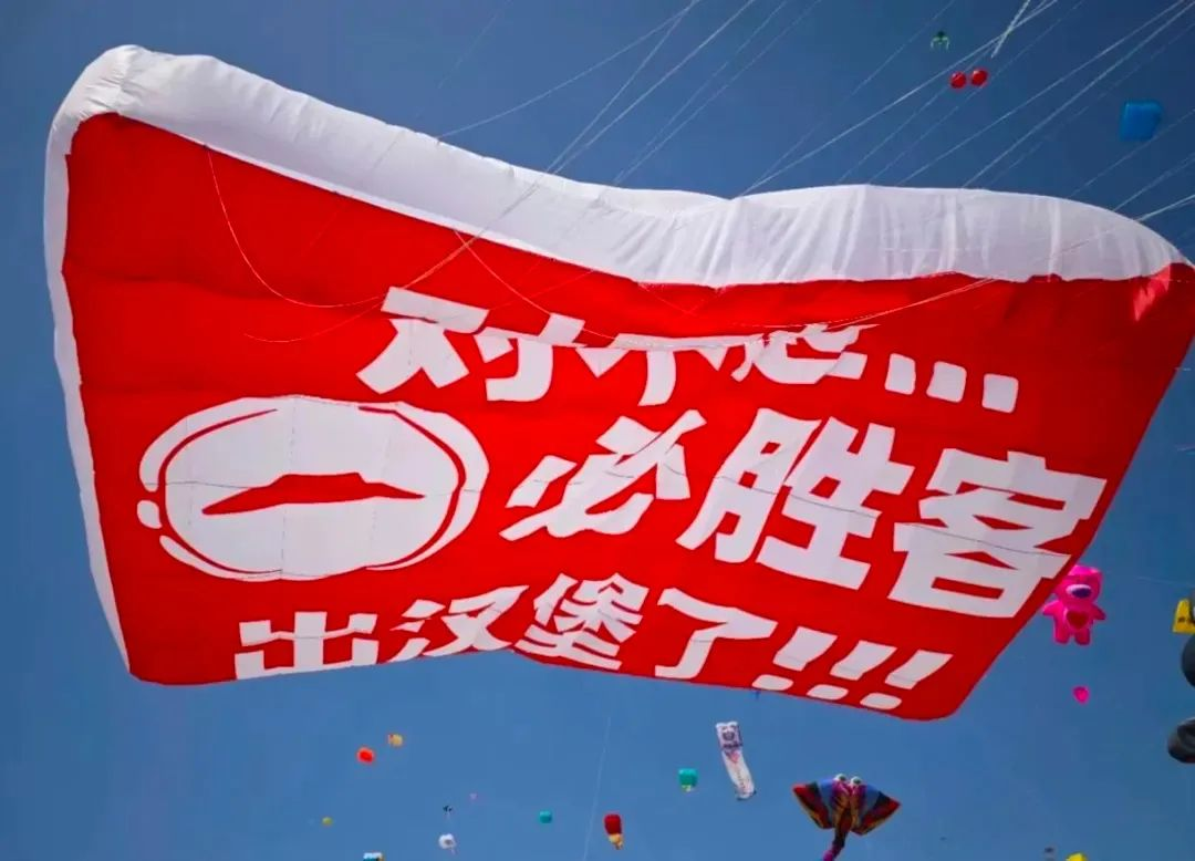去年的風(fēng)箏節(jié),眾多品牌紛紛參與“發(fā)瘋營銷”的浪潮,將這一傳統(tǒng)活動(dòng)推向了新的高峰。在風(fēng)箏節(jié)期間,淘寶連續(xù)兩年推出的巨型“放屁”風(fēng)箏成為焦點(diǎn)。這種打破常規(guī)、充滿娛樂性的廣告方式,不僅吸引了眾多目光,更讓年輕人在歡笑中釋放了壓力。而必勝客則通過簡潔的大字報(bào)形式,宣布“必勝客推出漢堡”,這種直接而簡單的營銷手段,同樣給人留下了深刻的印象。