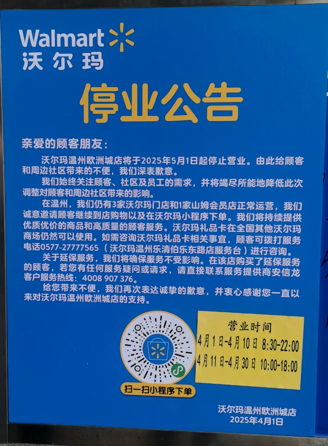行至2025年,除了如胖東來、山姆等商超企業(yè),超市行業(yè)的生意依然難做。4月1日,沃爾瑪溫州市區(qū)最后一家門店宣布將于5月1日停業(yè),該店是繼沃爾瑪東海店、沃爾瑪鴻瑛店之后,溫州市區(qū)營業(yè)的唯一一家實體店。在關閉門店的公告中,沃爾瑪明確表示,關店原因主要歸結為戰(zhàn)略調整以及合同或租約到期。其中廣州新港店,由于所在商城整體改造升級,預計今年10月將重新開業(yè)。